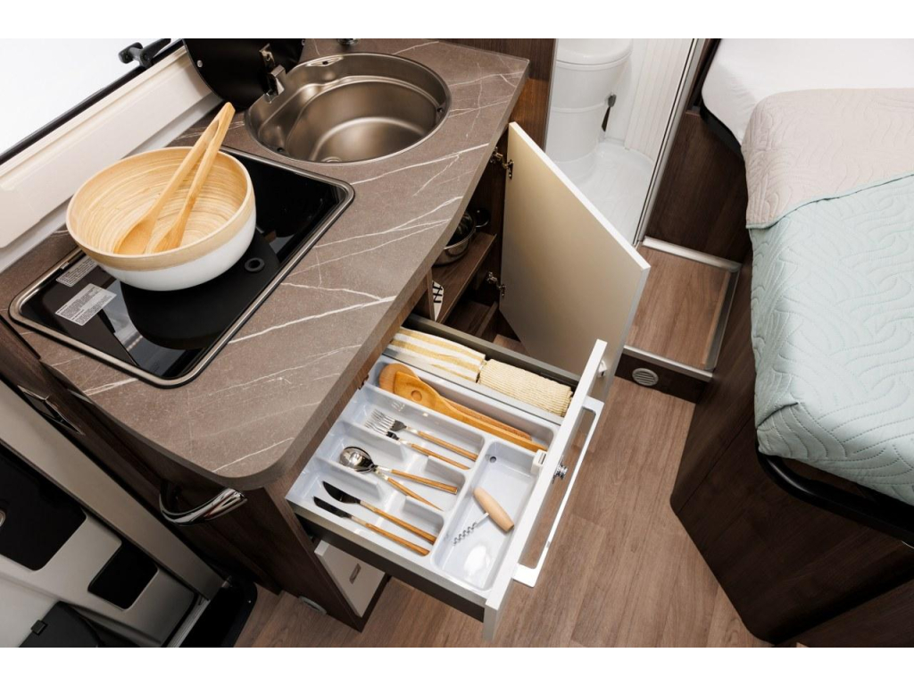 • Hoogwaardige Dometic D-LUX inbouwramen voorzien van hor en verduistering