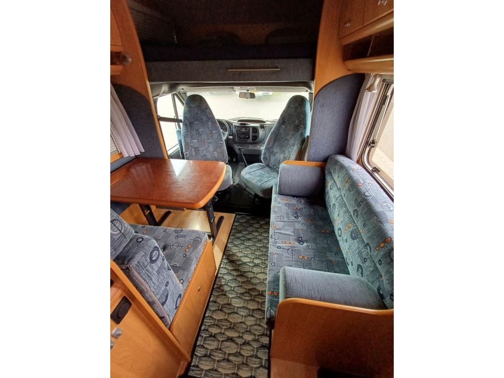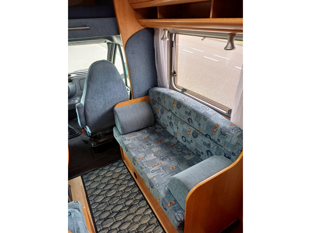 Bovenin de alkoof bevindt zich een ruim bed voor 2 personen, voorin is een zithoek met 2 draaibare stoelen en een 2 zitbanken.
