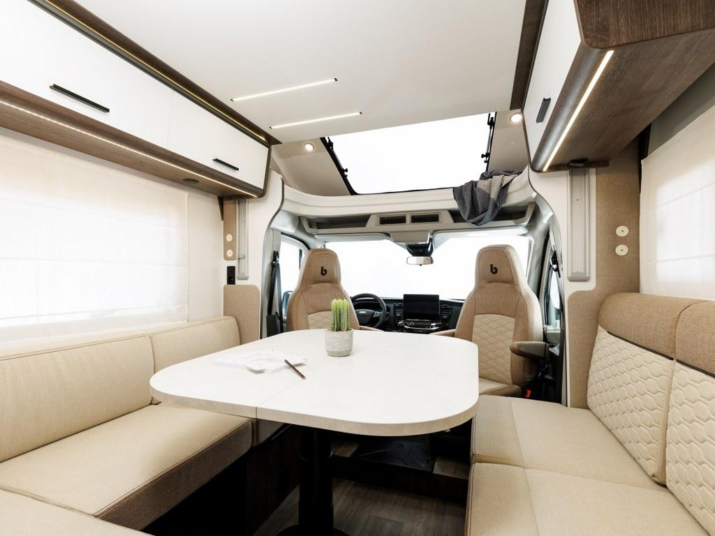 PLUS PAKKET: Voorbumper in kleur van cabine + Halogeenverlichting en hoekspot + Luxe plissé verduistering in de cabine + Dashboard met chroom accenten + Handschoenenkastje met slot + Cabinestoelen bijpassend bekleed bij zitbanken + Skyview dakraam met hor en verduistering + LED buitenlamp + Extra brede camperdeur met dubbele veiligheidssluiting, raam, hordeur en prullenbak + Achteruitrijdsensoren + Zonnepaneel 200 W met MPPT-regelaar + Voorbereiding voor 2e accu + Bovenkasten met (in)directe LED-verlichting + Stoffen rolgordijn + Dinnette-stoelen met ISOFIX + TV steun