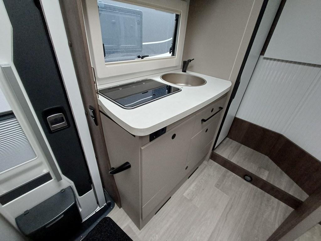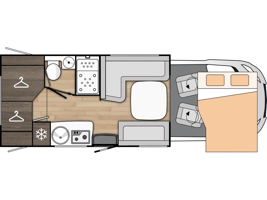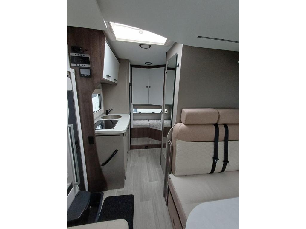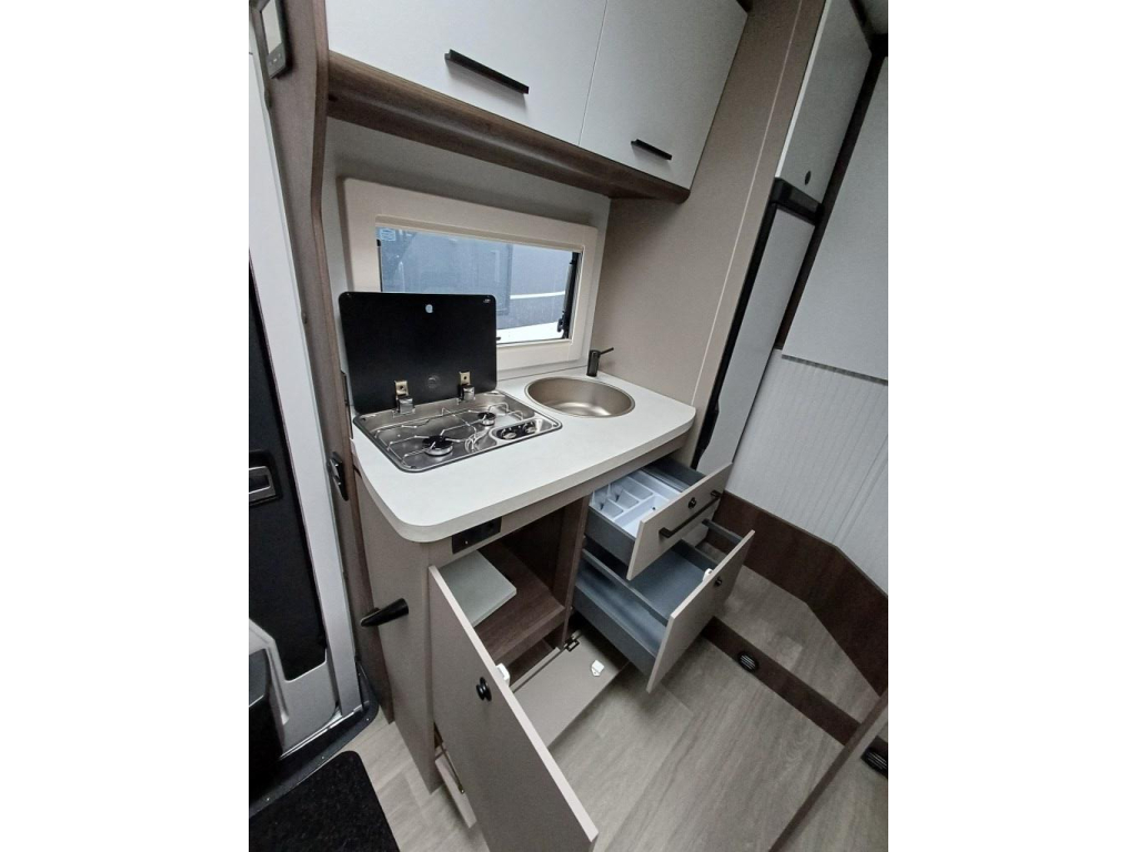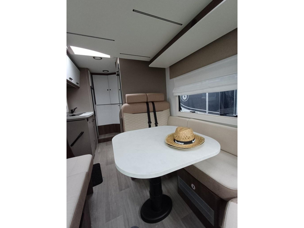 PLUS PAKKET: Voorbumper in kleur van cabine + Halogeenverlichting en hoekspot + Luxe plissé verduistering in de cabine + Dashboard met chroom accenten + Handschoenenkastje met slot + Cabinestoelen bijpassend bekleed bij zitbanken + Skyview dakraam met hor en verduistering + LED buitenlamp + Extra brede camperdeur met dubbele veiligheidssluiting, raam, hordeur en prullenbak + Achteruitrijdsensoren + Zonnepaneel 200 W met MPPT-regelaar + Voorbereiding voor 2e accu + Bovenkasten met (in)directe LED-verlichting + Stoffen rolgordijn + Dinnette-stoelen met ISOFIX + TV steun
