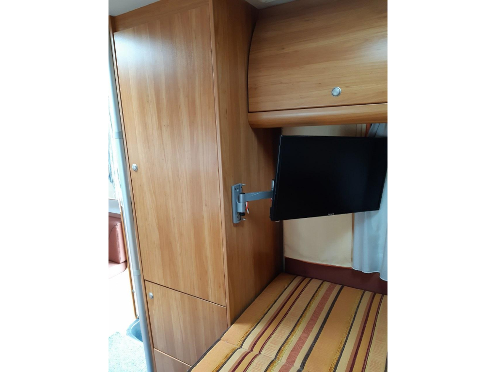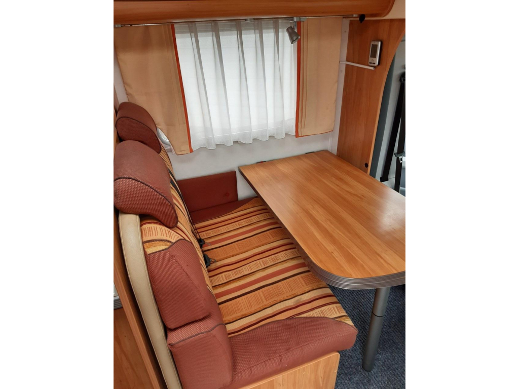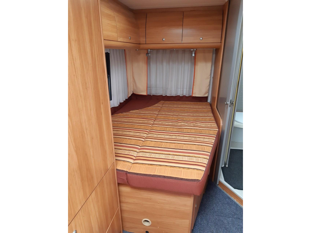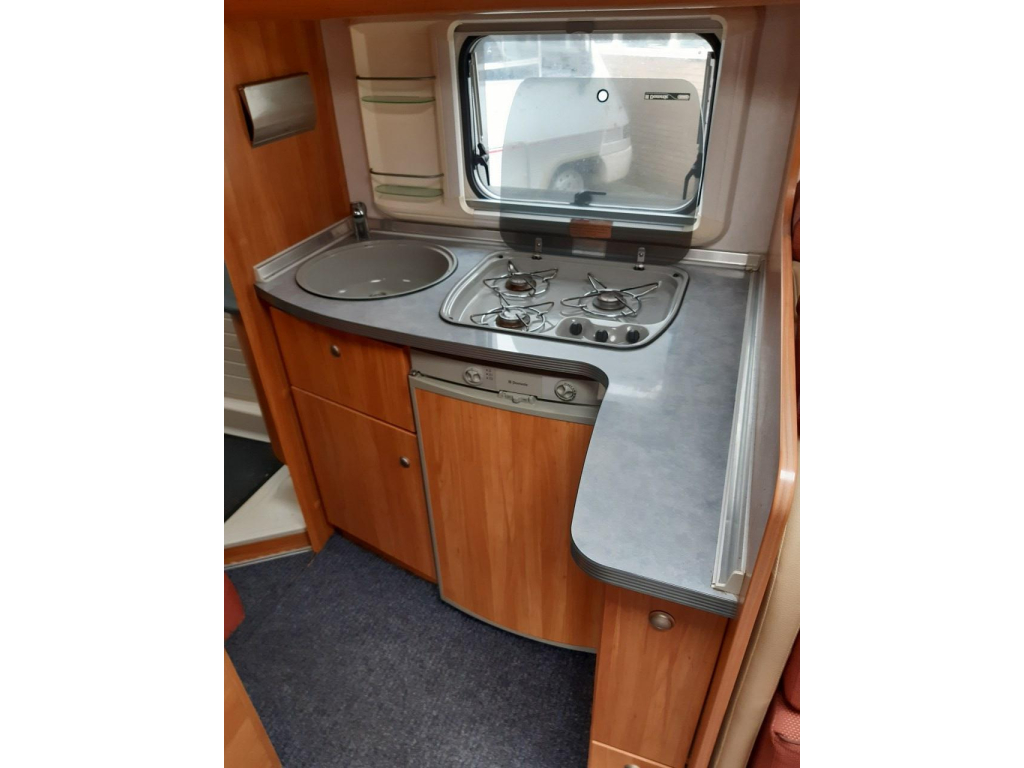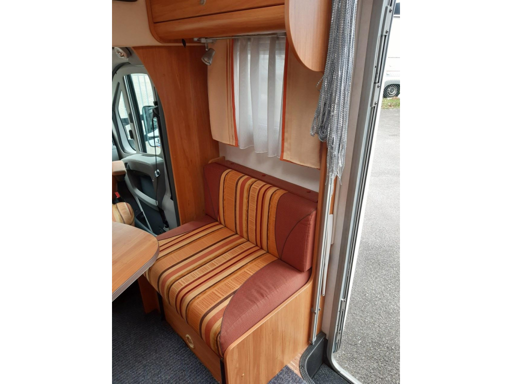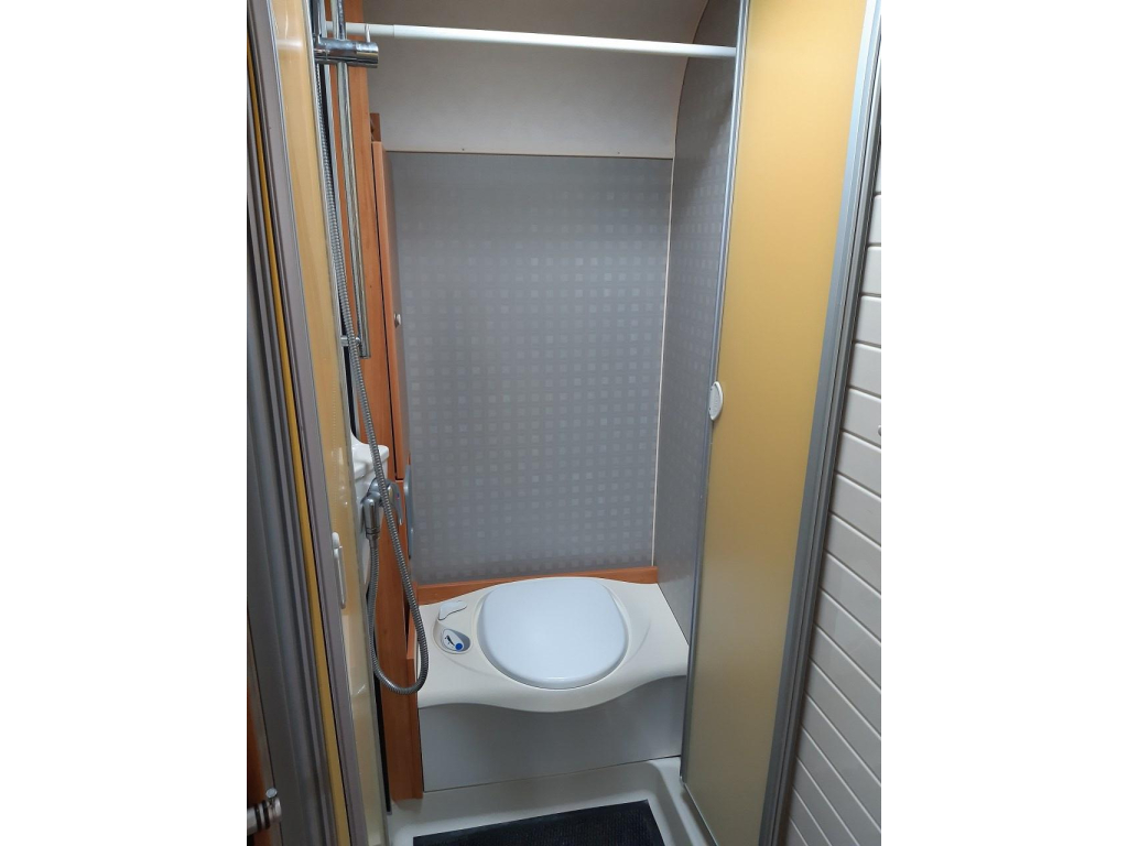 Achterin is een frans bed (195x135), dat breed toegankelijk is, en ook niet te hoog. Naast het bed is de natcel met douche, toilet en wasbak. De keuken heeft een 3 pits gasstel met wasbak, koelkast met vriesvak en een boiler. In het woongedeelte bevindt zich ook nog een chauffage-en-route, een luxe verwarming tijdens het rijden. Deze verwarming gebruikt de warmte van de motor, waardoor de camper ook op koude dagen - tijdens het rijden - achterin heerlijk wordt verwarmd.