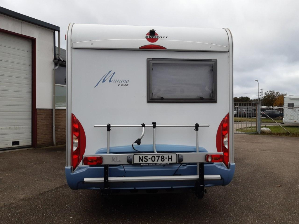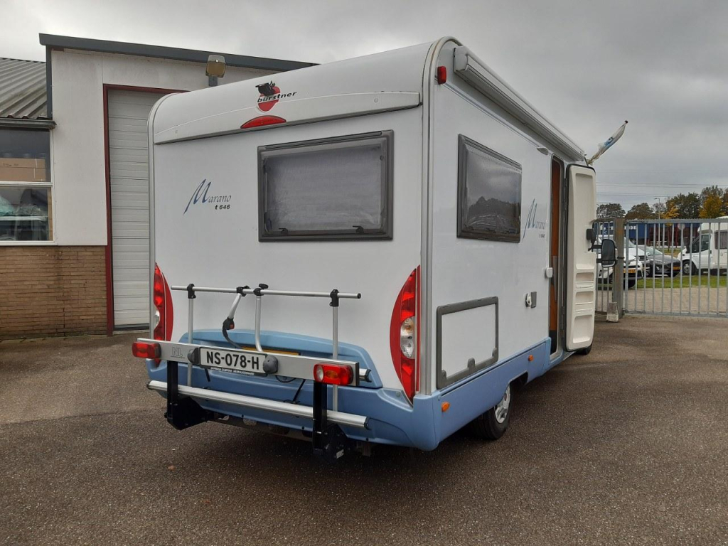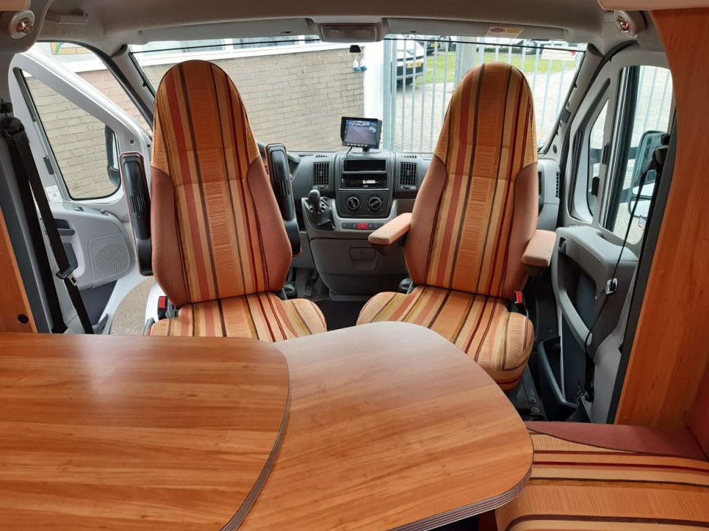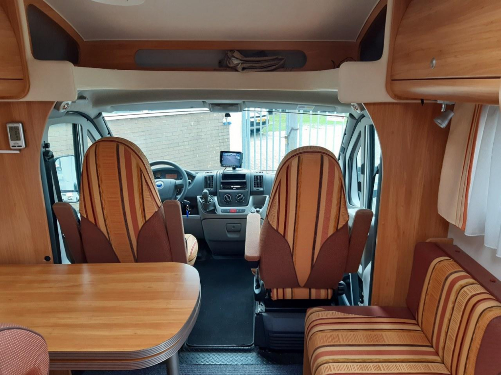 Mooie, goed uitziende halfintegrale Bürstner. De camper is laag en mooi gestroomlijnd. Voorin heeft deze Bürstner een ruime zitgroep met twee bankjes en luxe, draaibare pilootstoelen met dubele armleuningen. De camper is van voor naar achteren gelijkvloers.