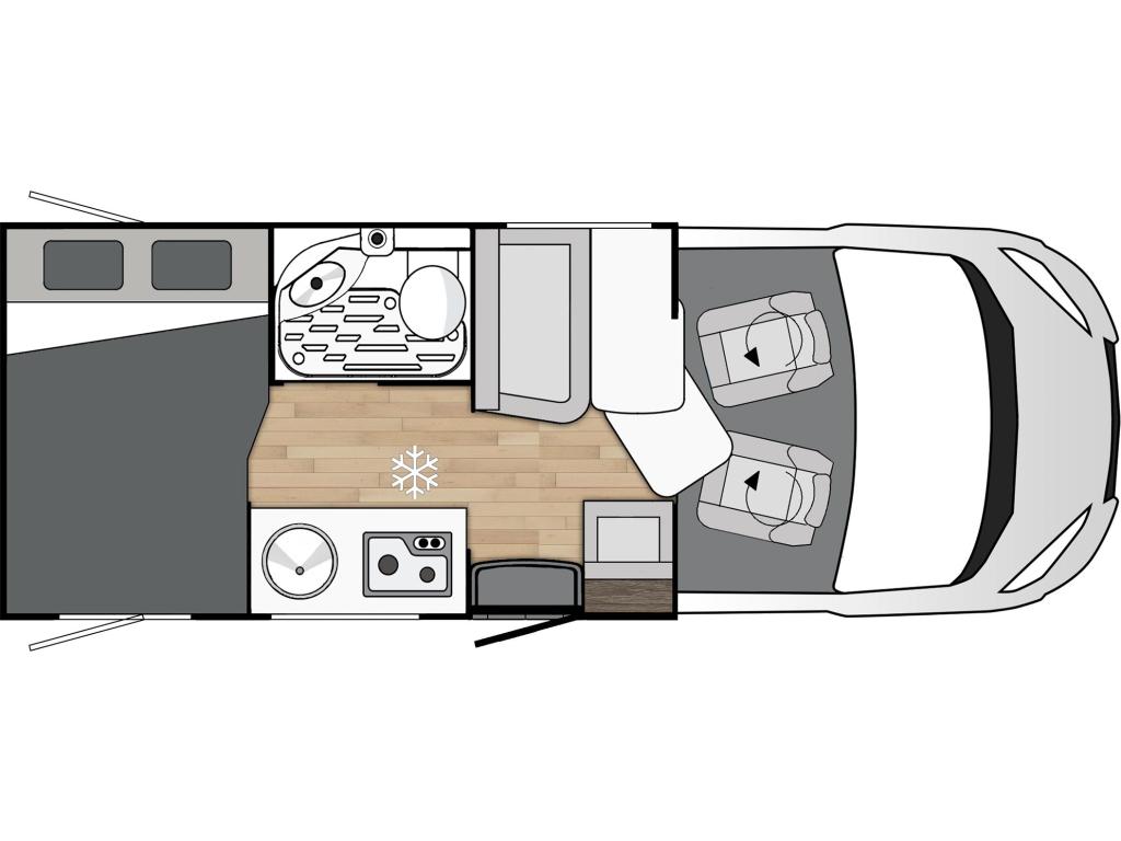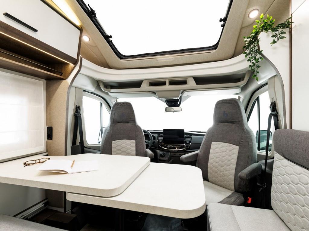 Bestuurders- en passagiersstoelen die kunnen worden neergeklapt, draaibaar, in hoogte verstelbaar zijn en twee armleuningen hebben