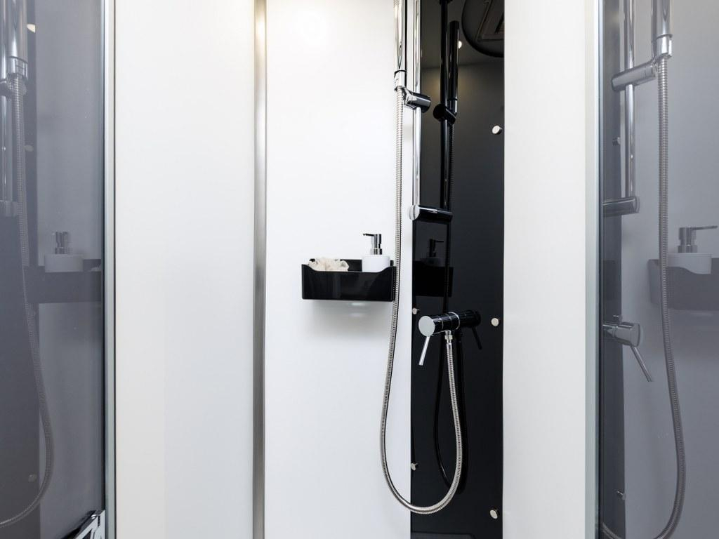 Separate douche met opbergmogelijkheden voor de toiletspullen en handdoekrek