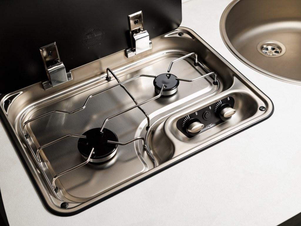 Verzonken spoelbak en 2-pits RVS gasstel met elektrische ontsteking