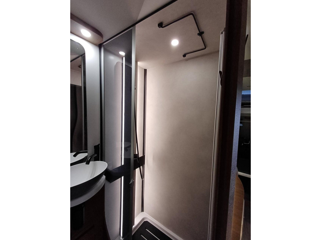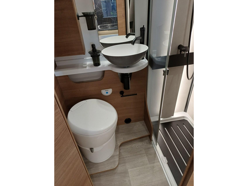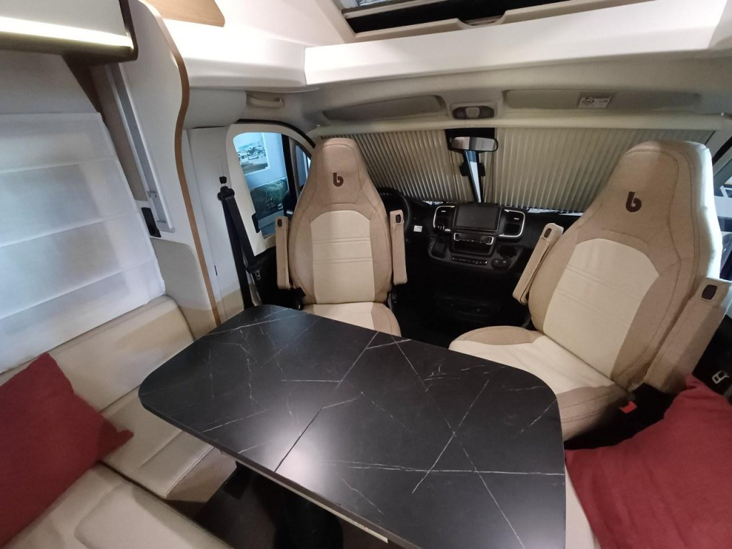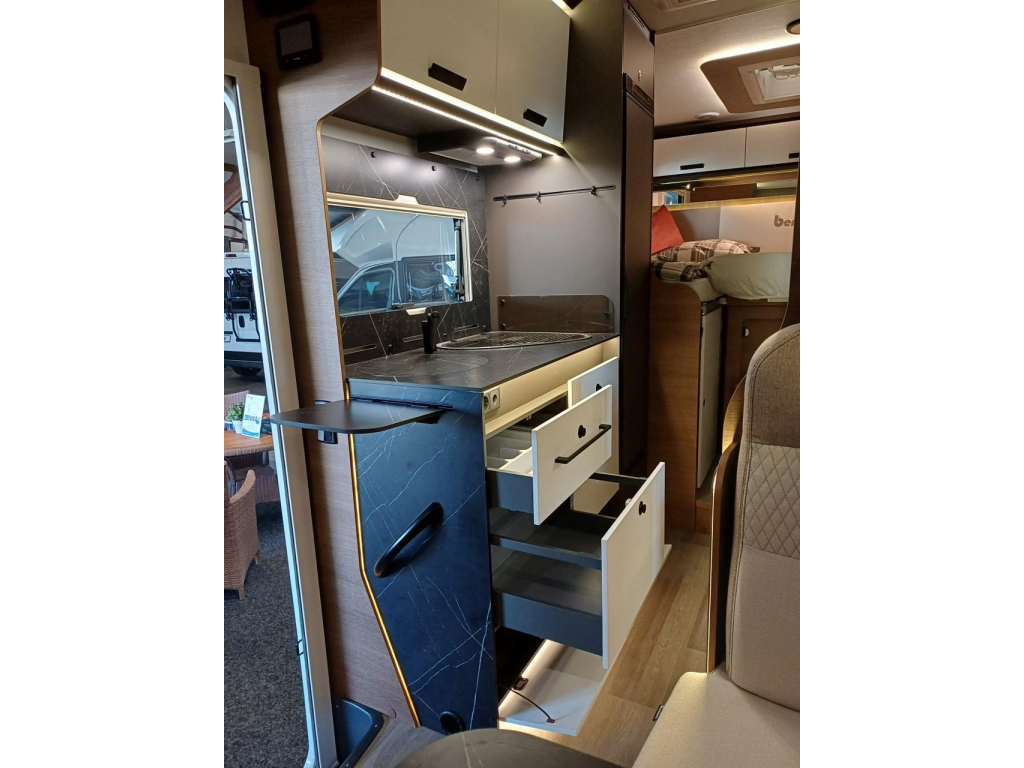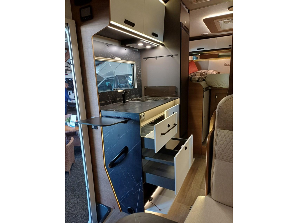 PLUS PAKKET: electr.handrem, 16"aluvelgen, leren stuur, dashboard met chroomdesign, achteruitrijsensoren, achteruitrijcamera, XL camperdeur met centrale dubbele sluiting, raam, afvalbak en plisséhor, 9"-DAB touch Pioneer, 200W solarsysteem + MPPT regelaar, LED buitenverlichting, verduisteringsplissé + stoelhoezen (in bijpassende bekleding) in cabine, afzuigkap, verlichting + rail en