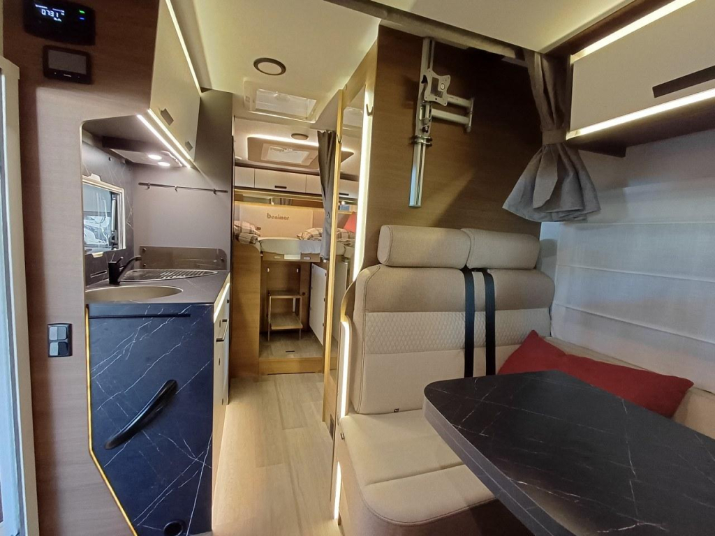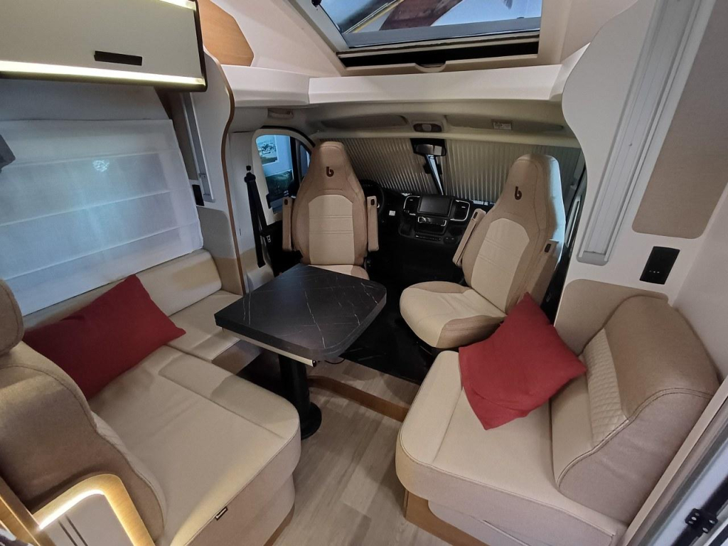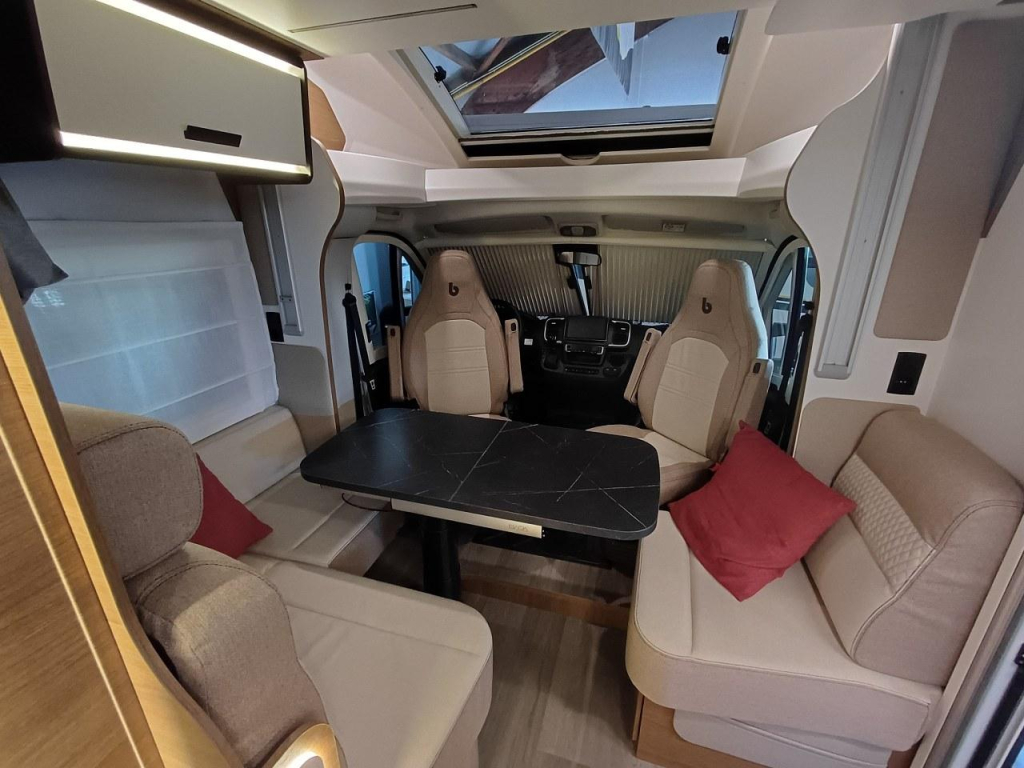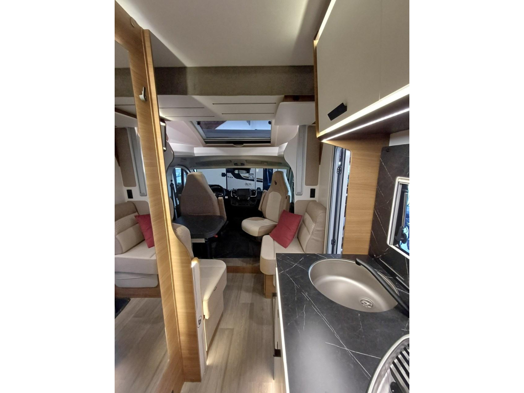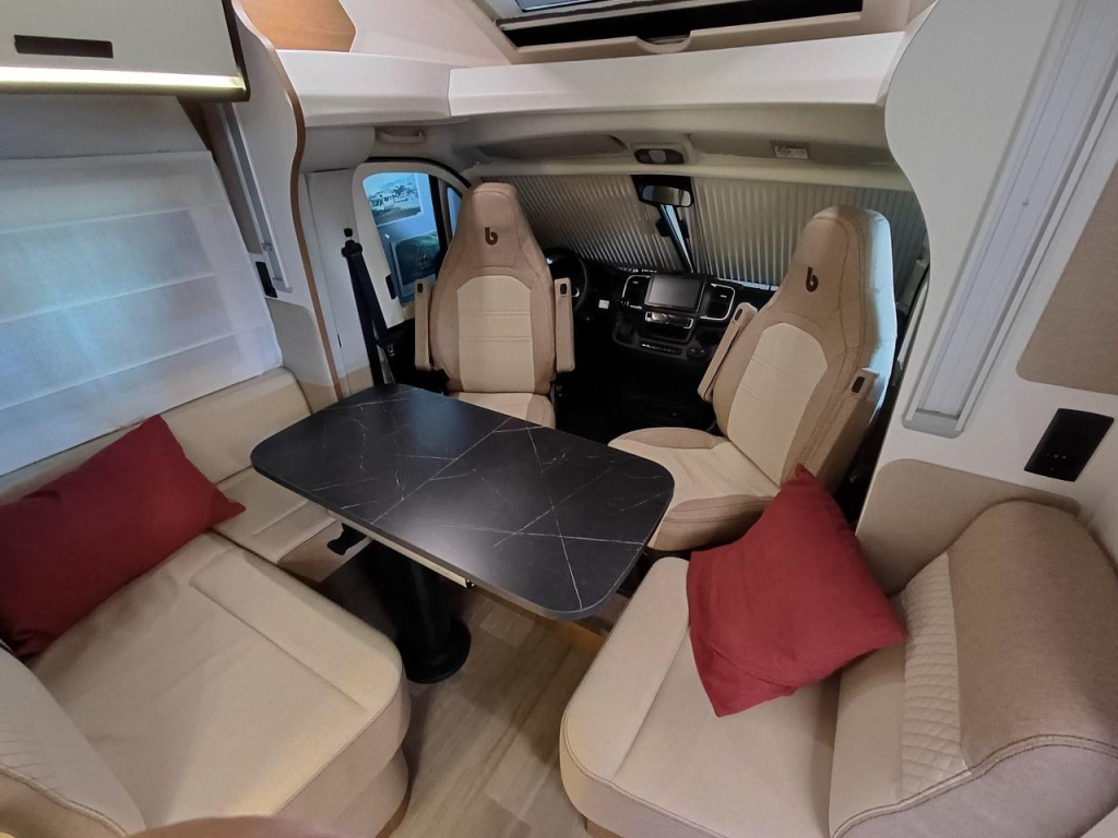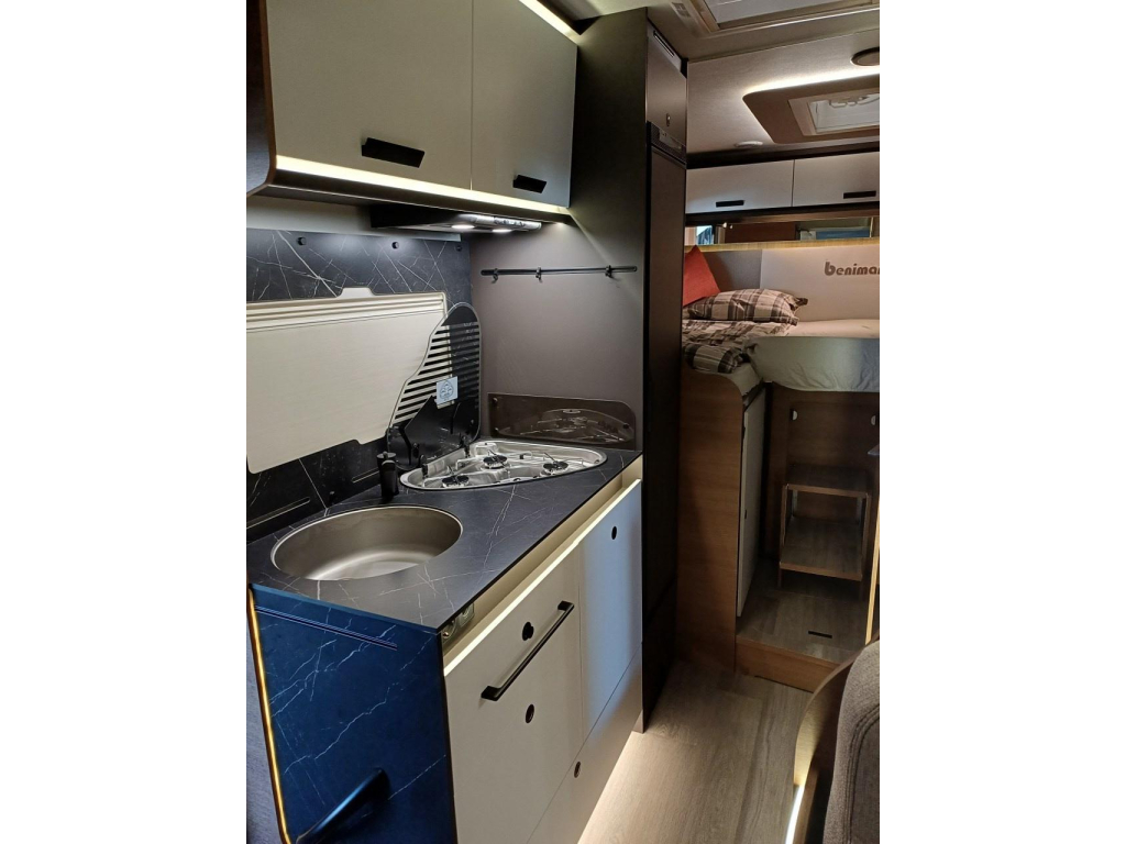 PLUS PAKKET: electr.handrem, 16"aluvelgen, leren stuur, dashboard met chroomdesign, achteruitrijsensoren, achteruitrijcamera, XL camperdeur met centrale dubbele sluiting, raam, afvalbak en plisséhor, 9"-DAB touch Pioneer, 200W solarsysteem + MPPT regelaar, LED buitenverlichting, verduisteringsplissé + stoelhoezen (in bijpassende bekleding) in cabine, afzuigkap, verlichting + rail en