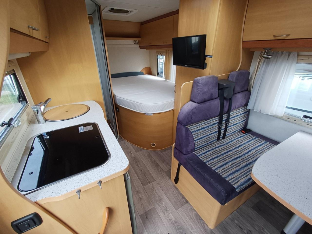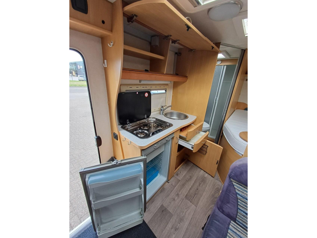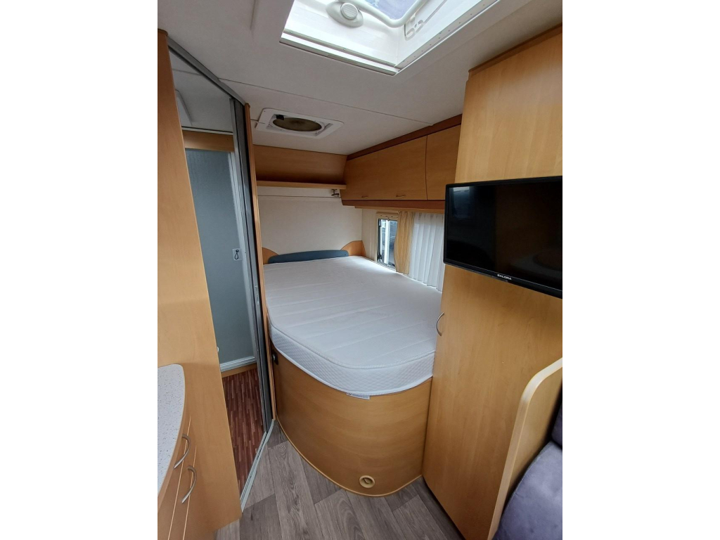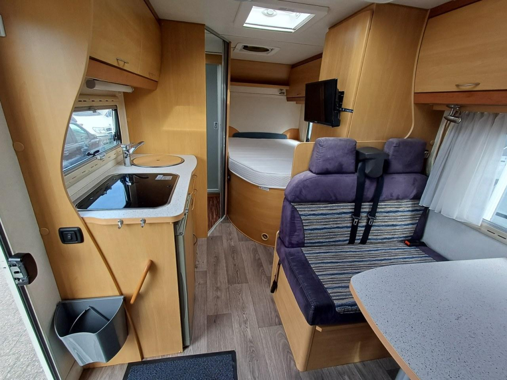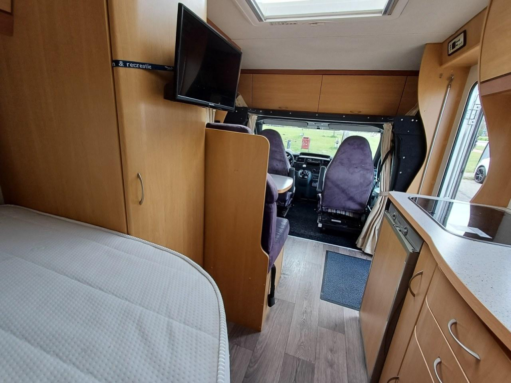 Achterin is een Frans bed met daaronder genoeg bergruimte, daarnaast de natcel met douche, toilet en wasbak. Voor de nodige ontspanning tijdens de vakantie is de camper voorzien van een televisie en radio.