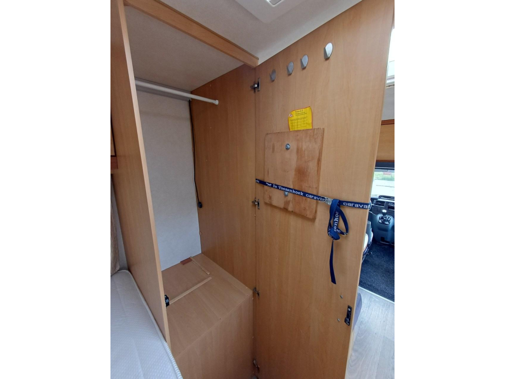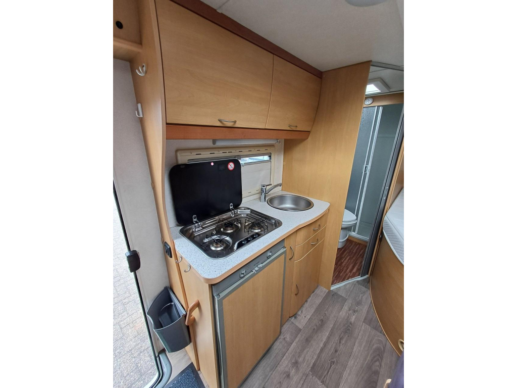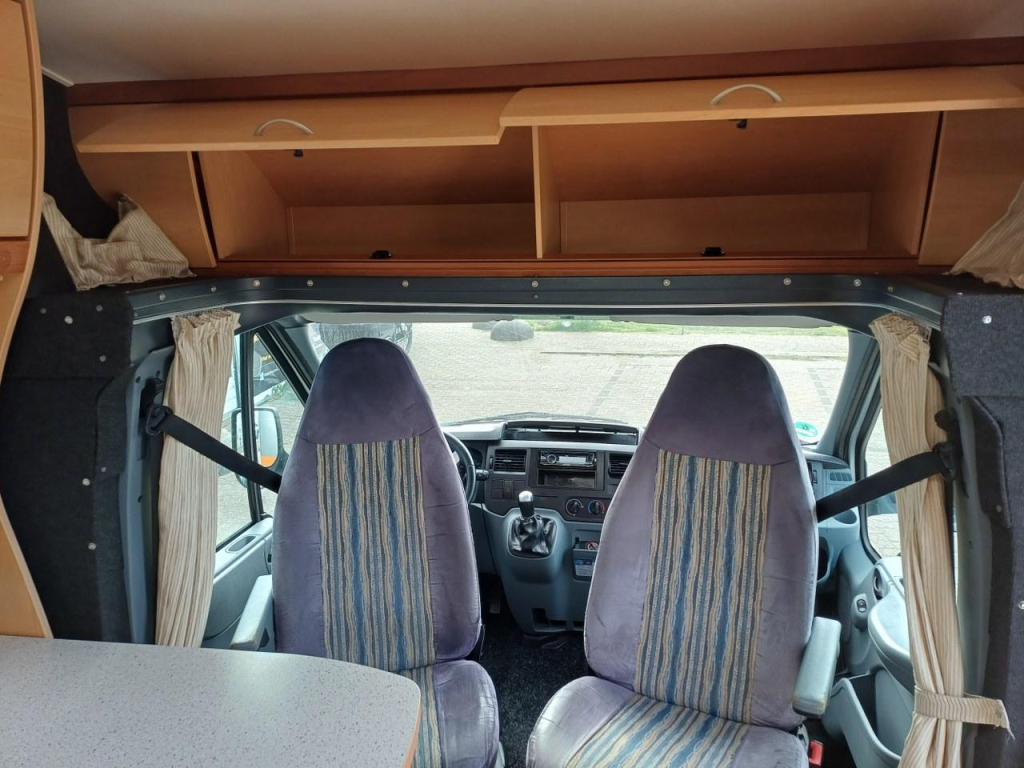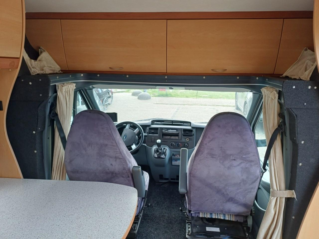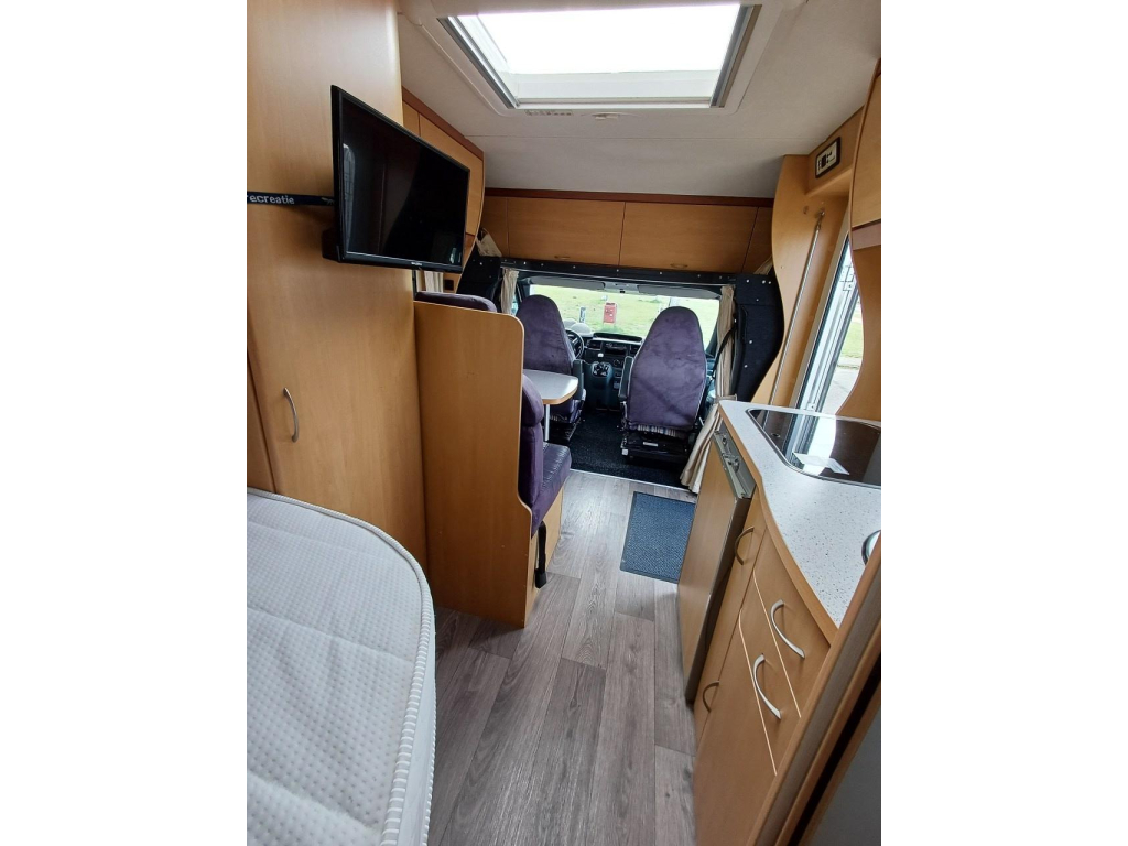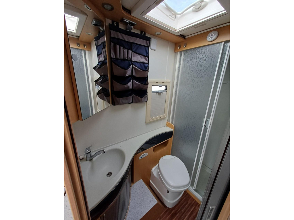 Achterin is een Frans bed met daaronder genoeg bergruimte, daarnaast de natcel met douche, toilet en wasbak. Voor de nodige ontspanning tijdens de vakantie is de camper voorzien van een televisie en radio.