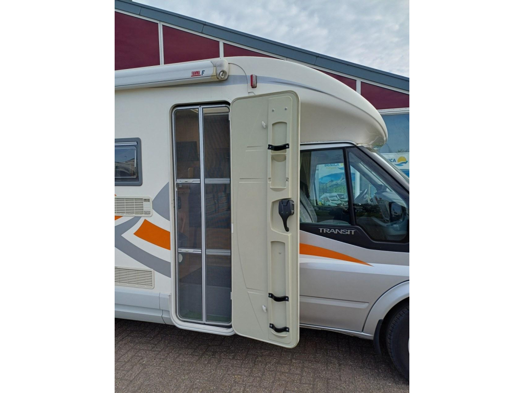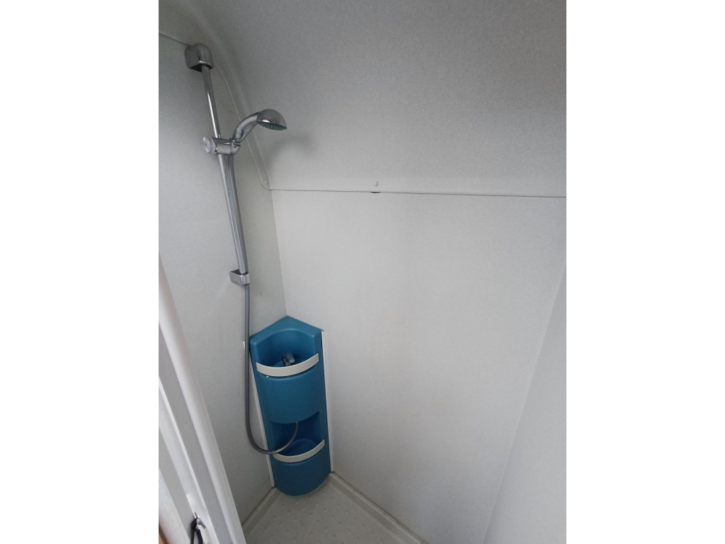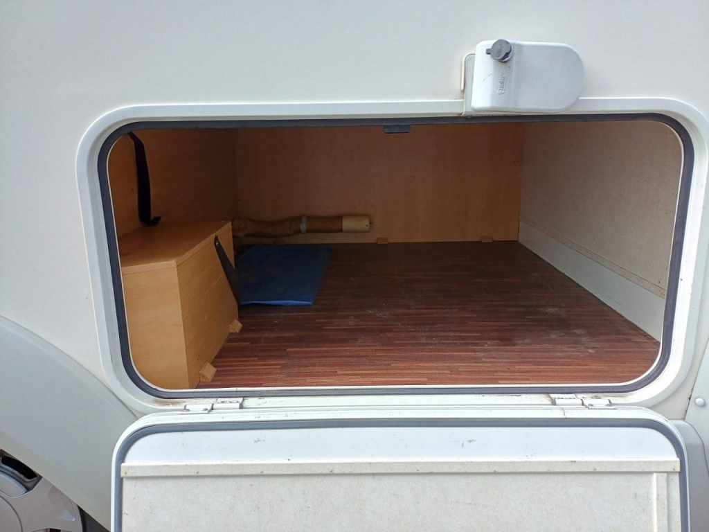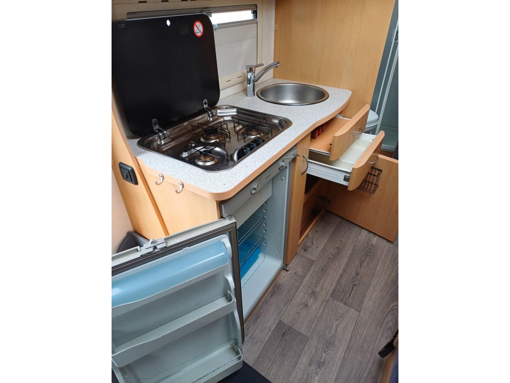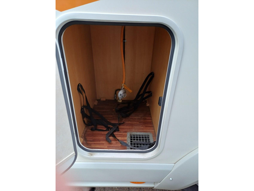 Achterin is een Frans bed met daaronder genoeg bergruimte, daarnaast de natcel met douche, toilet en wasbak. Voor de nodige ontspanning tijdens de vakantie is de camper voorzien van een televisie en radio.