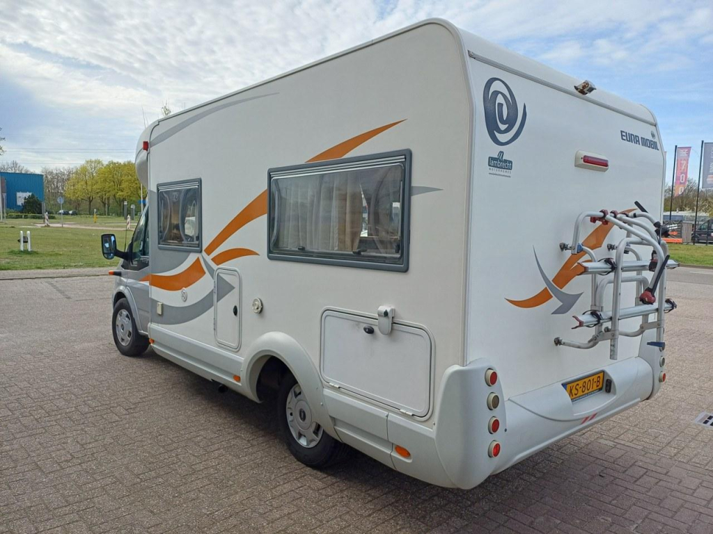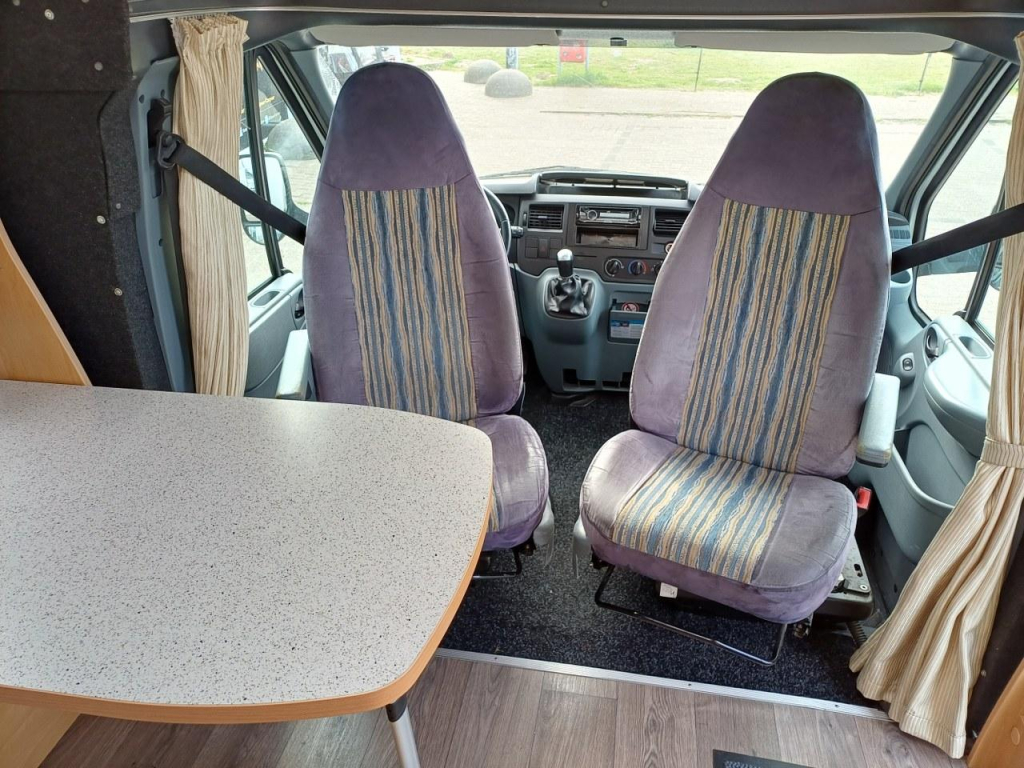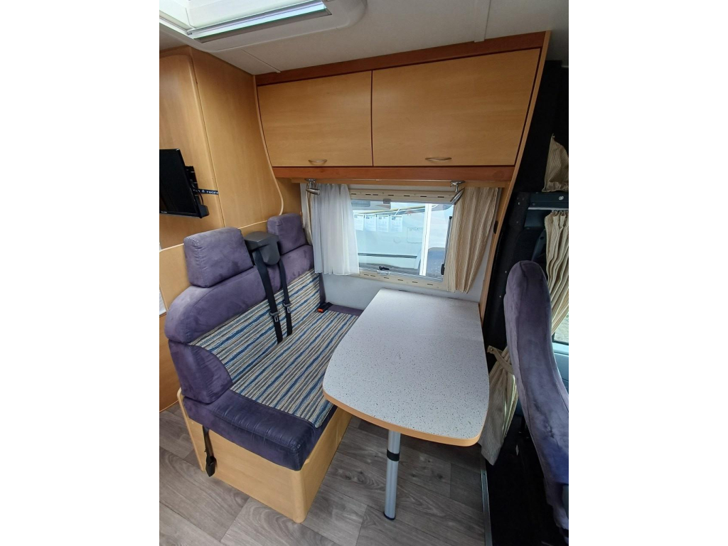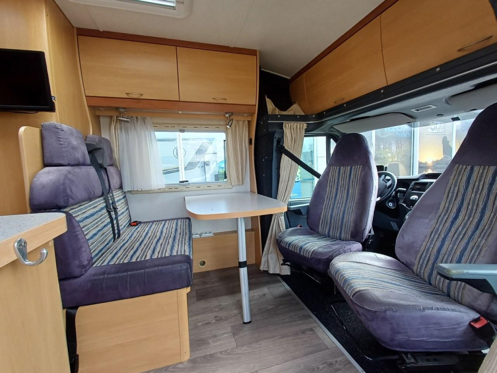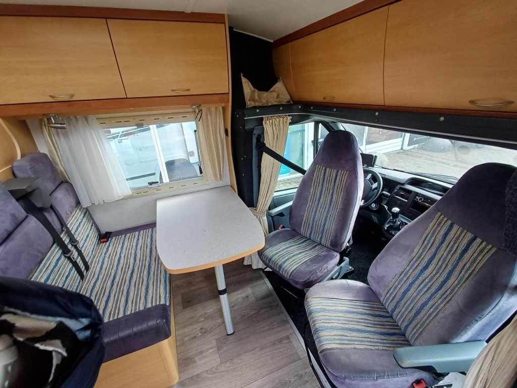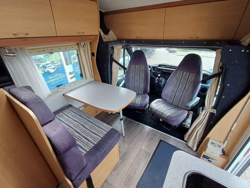 Zeer mooie ruime Euramobil occasion camper met voorin een zitgroep bestaande uit een bank met twee draaibare cabinestoelen, deze zitgroep is om te bouwen tot een bed.